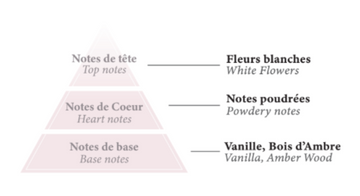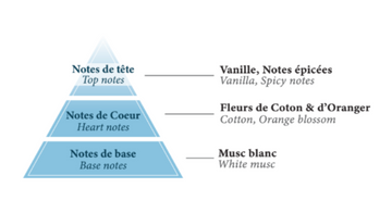 This soft, comforting fragrance blends the delicacy of white flowers with powdery notes, gently warmed by vanilla and amberwood.