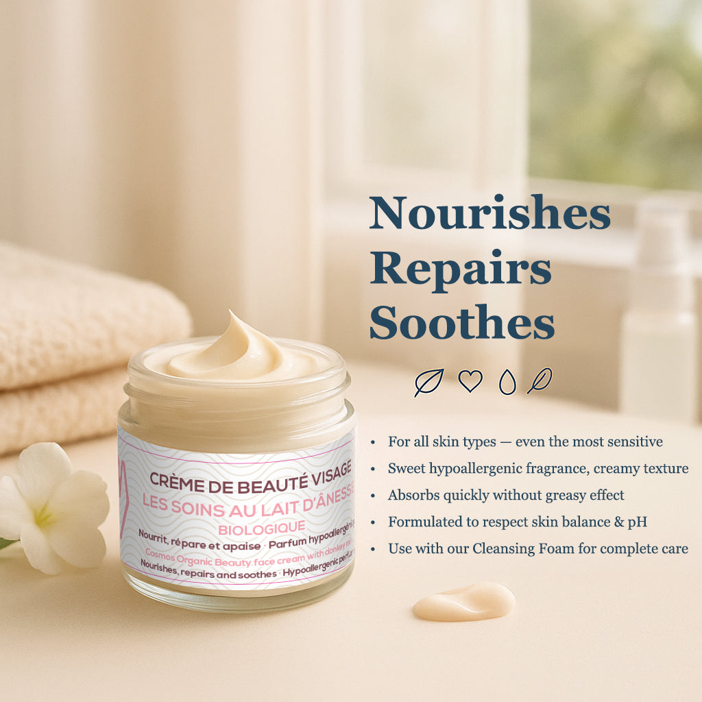 This organic donkey milk shea butter face cream nourishes and repairs facial skin. Its formula, which respects the skin's pH, is particularly suitable for sensitive skin. The presence of donkey milk, shea butter and jojoba oil intensely hydrates* dry skin. Composed of a hypoallergenic fragrance, this cream is even suitable for reactive skin. On a daily basis, you will appreciate its creamy texture and its soft green and floral fragrance. Before moisturizing your skin, it is essential that it is first thoroughly cleansed. For this, we recommend our new organic donkey milk cleansing foam! *Moisturizes the upper layers of the epidermis