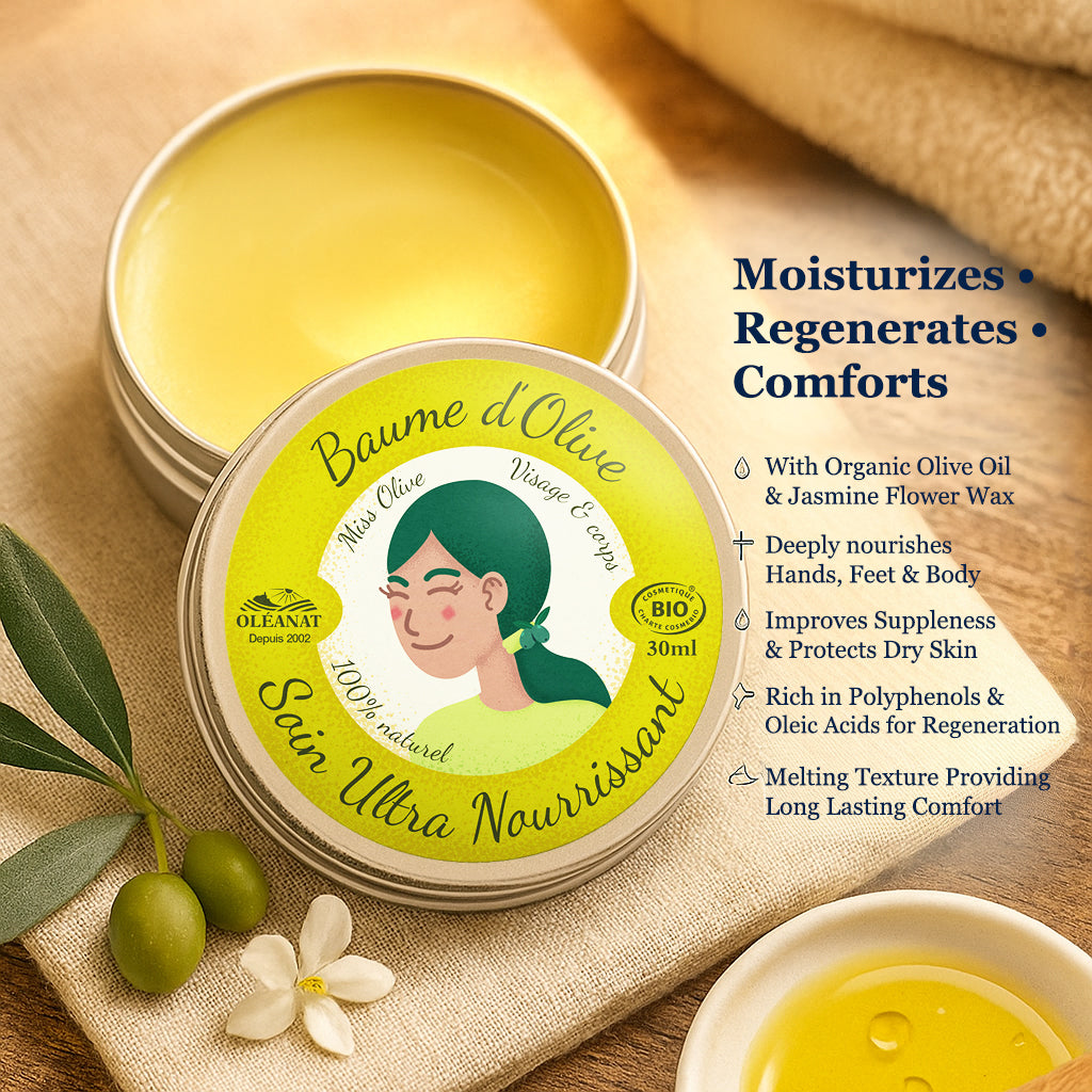 Olive Oil Balm is an ultra-nourishing treatment that improves the suppleness and softness of the skin. Enriched with Jasmine flower wax, it offers regenerating properties. This reinforces the moisturizing and antioxidant action of the oleic acids and polyphenols present in Olive oil. Perfectly suited for face, body and lips. Specially beneficial for extremely dehydrated hands and feet. This balm with a melting texture protects the skin while providing comfort and nutrition.