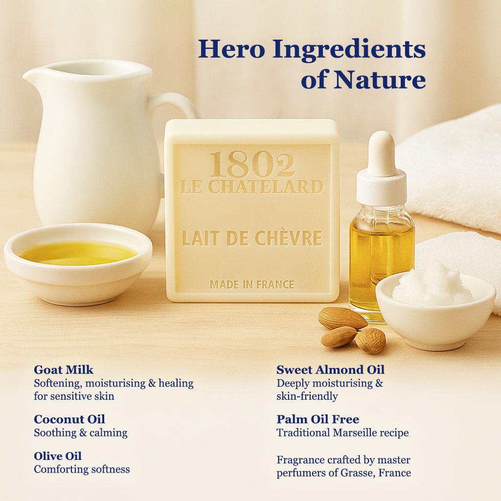 In our palm oil free soap, you will find real goat milk from organic agriculture. It comes from a small farm in the south of France, which we have carefully selected to offer you the best quality. In cosmetic applications, goat's milk is known for its repairing virtues. Sensitive skins love it!
